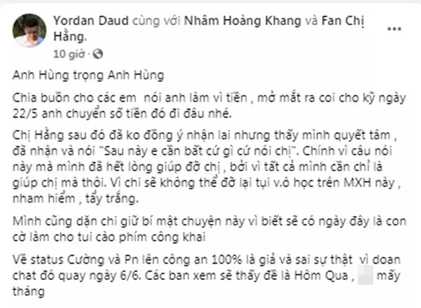 Anh tâm sự: "Anh hùng trọng anh hùng. Chia buồn cho các em nói anh làm vì tiền. Mở mắt ra coi cho kỹ ngày 22/5 anh chuyển số tiền đó đi đâu nhé (khi đó Khang chuyển 500 triệu trả bà Hằng như đúng tuyên bố trước đó - PV).