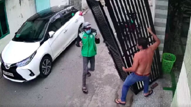 Thời điểm này, một tài xế công nghệ lái xe máy chạy đến, suýt chút nữa thôi, 1 trong 2 cánh cửa sắt đã đè trúng người này. Tình huống bất ngờ ập đến, tài xế công nghệ loạng quạng suýt ngã ra đường, rất may mắn tài xế đã kịp phản ứng.