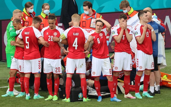 Trên sân cỏ, các cầu thủ Đan Mạch tạo thành một bức tường người để che chắn khi nhân viên y tế hô hấp nhân tạo, ép tim cho Eriksen. Hình ảnh này được nhiều người chia sẻ trên mạng xã hội để kêu gọi mọi người bảo vệ riêng tư cho chân sút Đan Mạch cũng như gia đình anh.