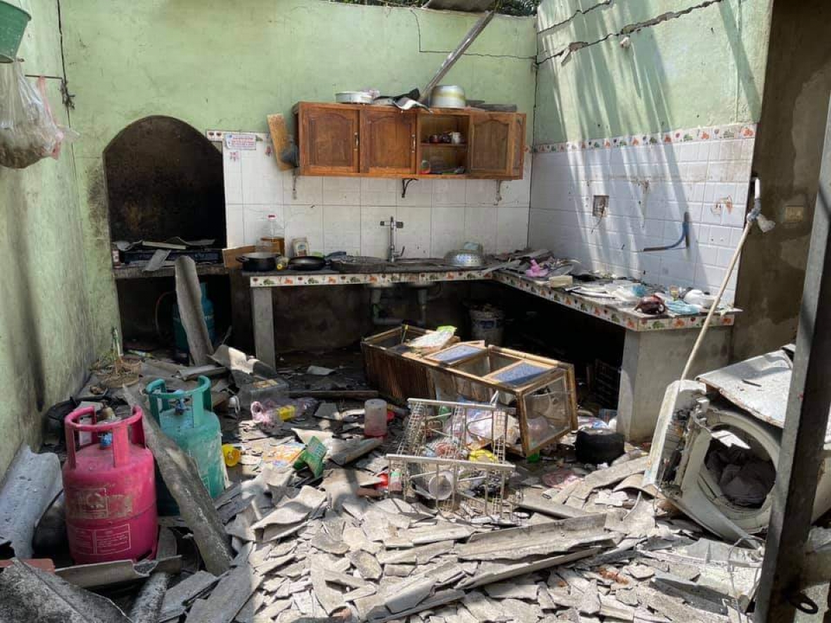 Khi vụ nổ xảy ra, một cột khói lớn màu trắng bốc lên cao, toàn bộ mái nhà bếp và mái nhà kho giáp bếp lợp bằng tấm Fibro xi măng bị vỡ, rơi xuống nền nhà. Các ô cửa bếp bị vỡ kính, biến dạng, một số đồ dùng để tại bếp như tủ lạnh, máy giặt… bị vỡ, hư hỏng, trong bếp có 3 bình gas còn nguyên vẹn.