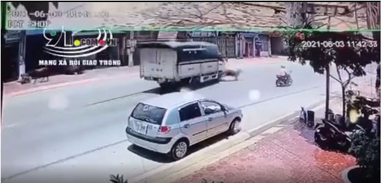 Cụ thể, một chiếc xe tải đang lưu thông thì bất ngờ gặp phải tình huống một con bò chạy thục mạng sang đường. Không kịp trở tay, xe tải đã tông trúng con bò này khiến 'nạn nhân' bị húc văng, trượt ngã trên đường.