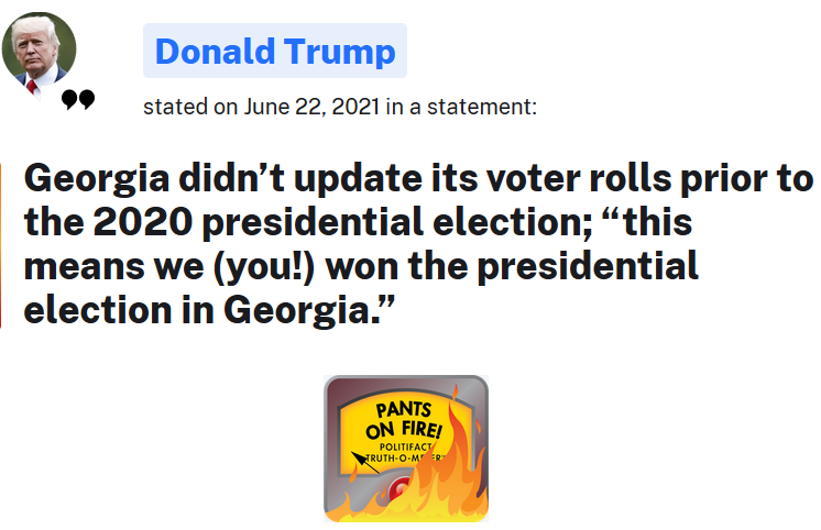 Trump said Georgia didn’t update its voter rolls prior to the 2020 presidential election and "this means we (you!) won the presidential election in Georgia."