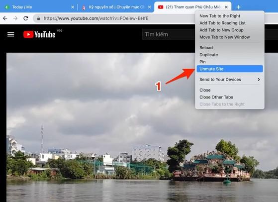 Nếu trước đó bạn đã vô tình kích hoạt tính năng Mute site (tắt tiếng trang), bạn chỉ cần mở trình duyệt và truy cập vào YouTube, sau đó nhấn phải chuột vào tab (thẻ) đó và chọn Unmute site (dừng tắt tiếng trang).