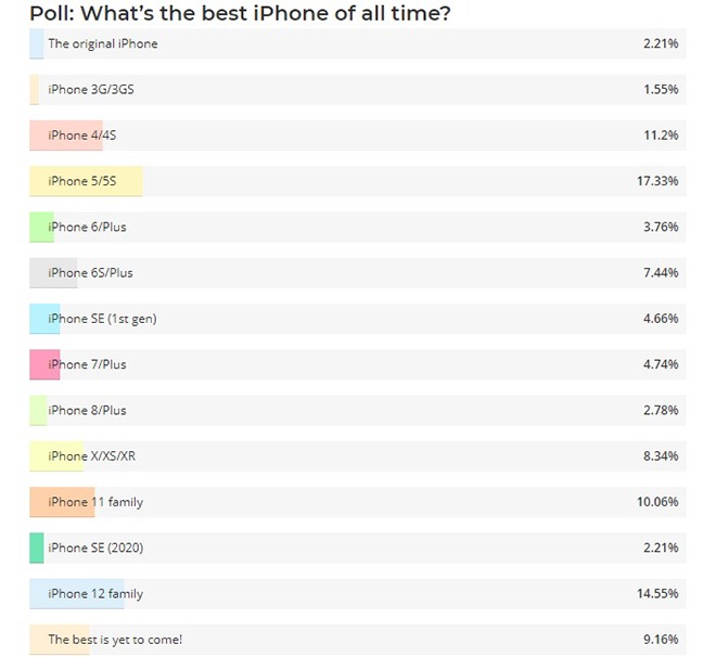 Cặp iPhone 5/ iPhone 5S có tỷ lệ yêu thích lớn nhất, tiếp đến là lợt iPhone 12 2020 và theo sau là thế hệ iPhone 11 2019. Điều này chứng tỏ dòng iPhone mới của Apple thu được phản hồi khá tích cực. Giới công nghệ kỳ vọng, loạt iPhone 13 năm nay sẽ tiếp tục nhận được sự chào đón từ công chúng trên khắp thế giới.
