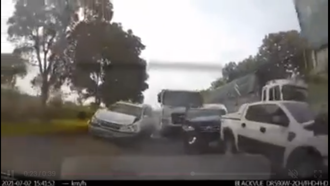 Chiếc xe to lớn lao thẳng vào nhóm xe con đang xếp hàng, đẩy các xe này sang hai hướng. Trong đó chiếc bán tải Ranger màu trắng bị đẩy vào đuôi xe tải phía trước.