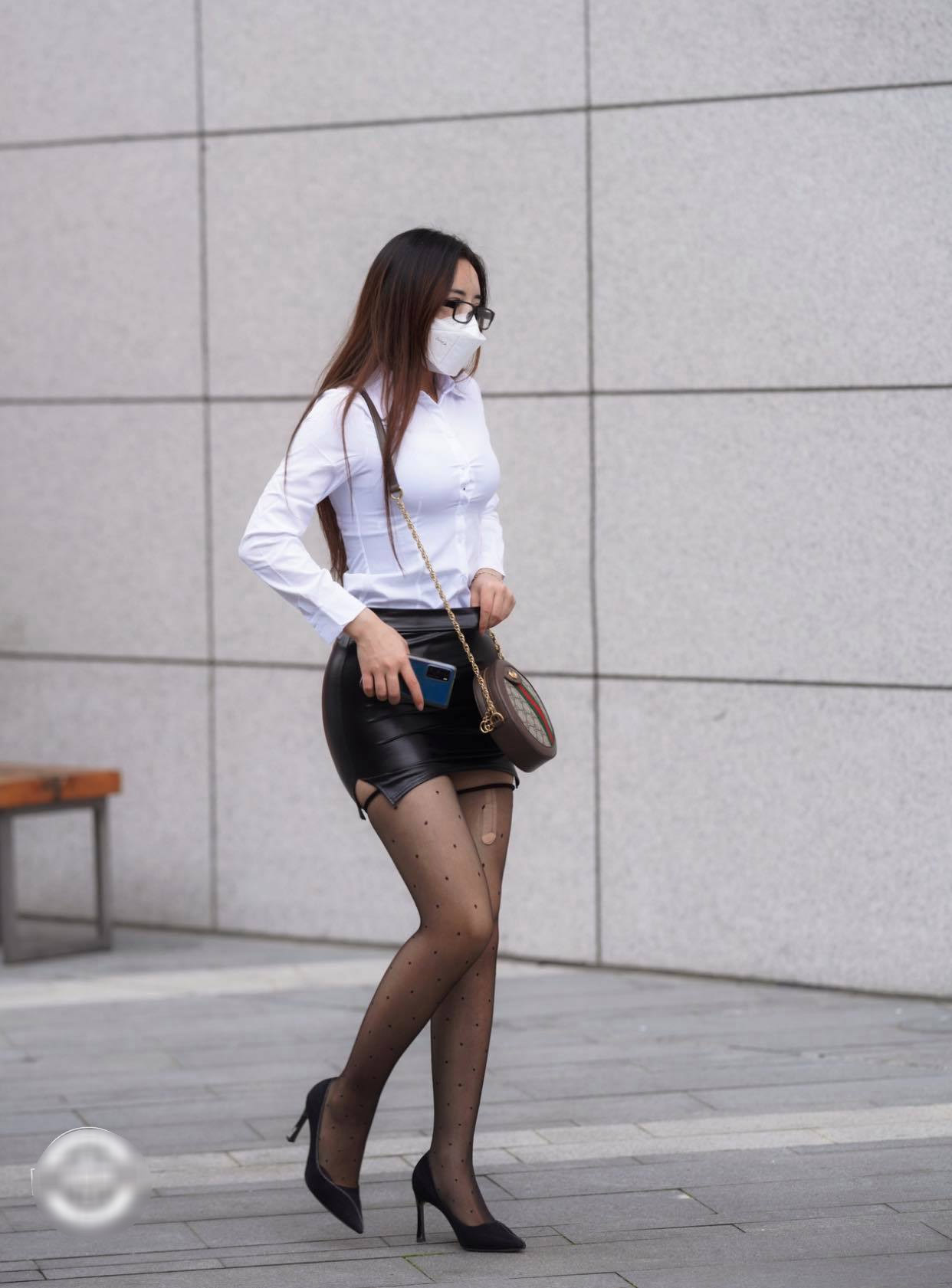 Mới đây, một cô nàng trở thành tâm điểm trên phố trong outfit công sở "lạc quẻ" bao gồm: áo sơ mi trắng, chân váy da xẻ hông tone sur tone với giày cao gót. Tuy nhiên, điểm đáng chú ý chính là đôi tất lưới chấm bi lưng chừng đùi nhưng rách lỗ chỗ. Không chỉ thế, áo sơ mi để lộ những khoảng hở hờ hững khi nhìn ngang, dễ tố cáo lớp nội y bên trong cũng là một điểm trừ trong set đồ này.