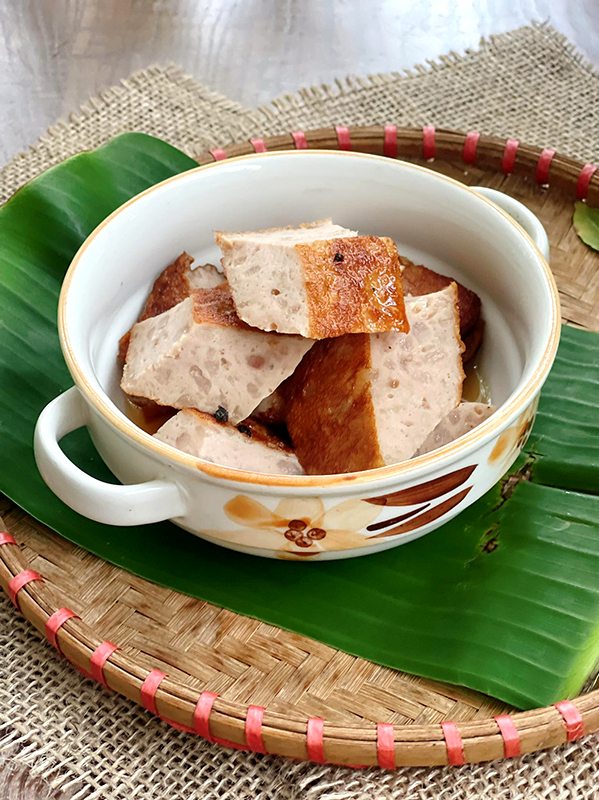 Chả mỡ mua về thái miếng vuông vắn vừa ăn. Bạn có thể đem chiên sơ cho hơi xém vàng nếu thích.