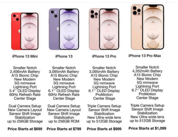 4 mẫu iPhone 13 sẽ có giá bán lần lượt là 699 USD, 799 USD, 999 USD, 1.099 USD ngang bằng với 4 mẫu iPhone 12 lúc ra mắt. Nhưng điều đáng chú ý là 2 mẫu iPhone 13 Pro và 13 Pro Max được dự đoán sẽ có màn hình 120Hz giúp hình ảnh chuyển động mượt mà hơn gấp đôi nhưng giá vẫn không hề thay đổi.