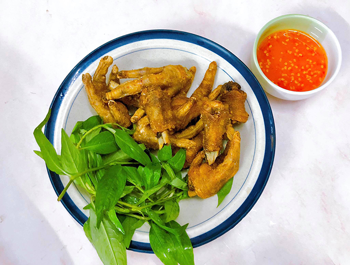 Chân gà chiên giòn cùng vị muối tỏi mặn ngọt lạ miệng, thích hợp khi nhâm nhi với bia.