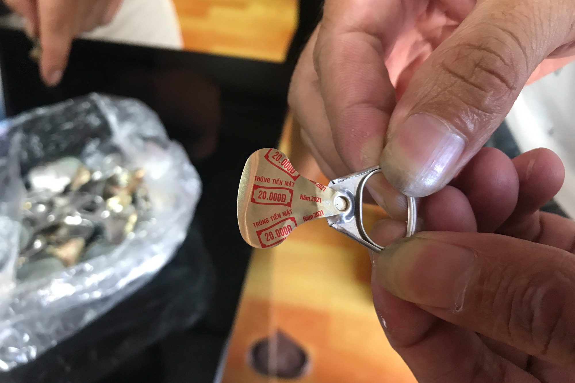 Khoen lon bia trúng thưởng với giá trị 20.000 đồng.