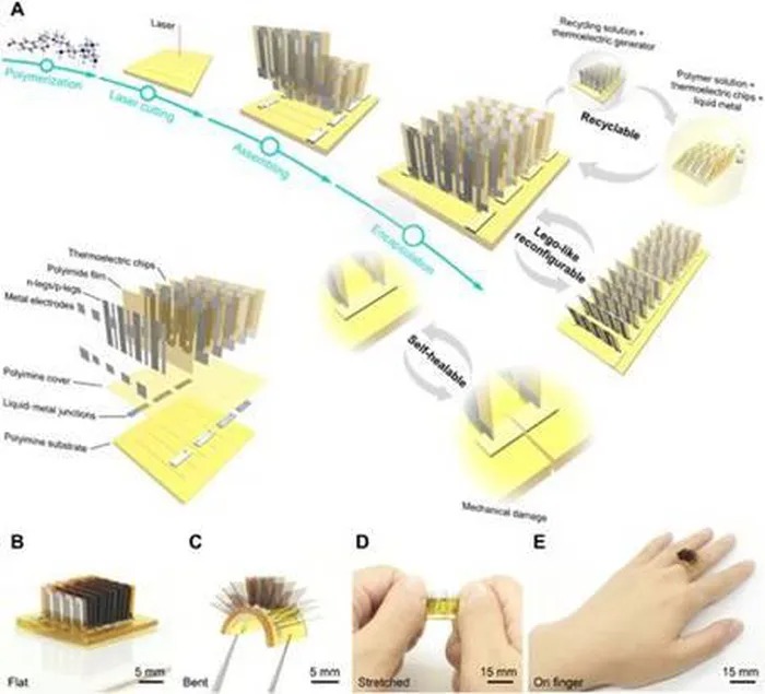 Sơ đồ minh họa về thiết kế, quy trình chế tạo và các đặc điểm chính (bao gồm khả năng tự phục hồi, tái chế và cấu hình lại giống như Lego) của TEG.