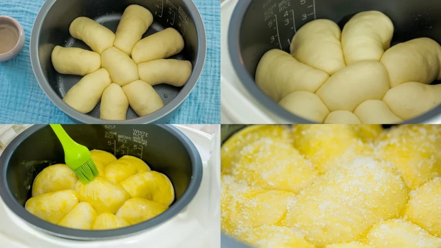 Dùng cọ quét một lớp mỏng dầu ăn trong nồi cơm điện, xếp bánh mì đã cuộn trái cây vào. Đậy nắp nồi cơm điện rồi ủ bánh lần 2 cho đến khi bánh nở gấp rưỡi. Mở nắp nồi cơm điện, dùng cọ quét một lớp mỏng lòng đỏ trứng lên trên, tiếp đó rắc thêm vụn dừa vào.