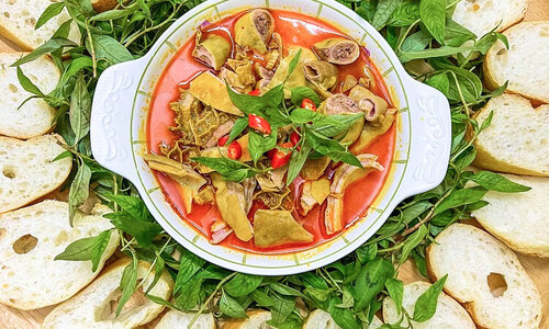 Món này ăn kèm với bánh mỳ, mỳ tôm rất ngon, nên ăn nóng và cũng không thể thiếu rau răm khi ăn kèm.