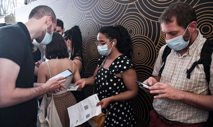 Người dân xuất trình giấy chứng nhận y tế trước khi vào một rạp chiếu phim ở Paris, Pháp, hôm 21/7. Ảnh: AFP.