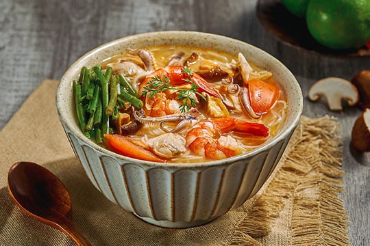 Trụng bún và rau muống qua nước sôi cho vào tô, trụng tái thịt bò trong nước dùng, xếp vào tô cùng các loại hải sản, cà chua, nấm, thêm 1M sữa đậu nành, nước dùng. Thả ít ngò lên trên, dùng nóng kèm chanh, ớt và nước mắm tùy khẩu vị.