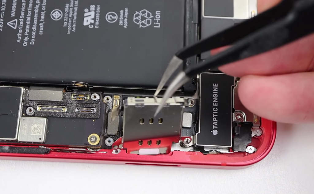 Tháo tiếp một số bộ phận liên quan rồi đến mạch đọc sim, nằm trên bộ rung Taptic Engine.