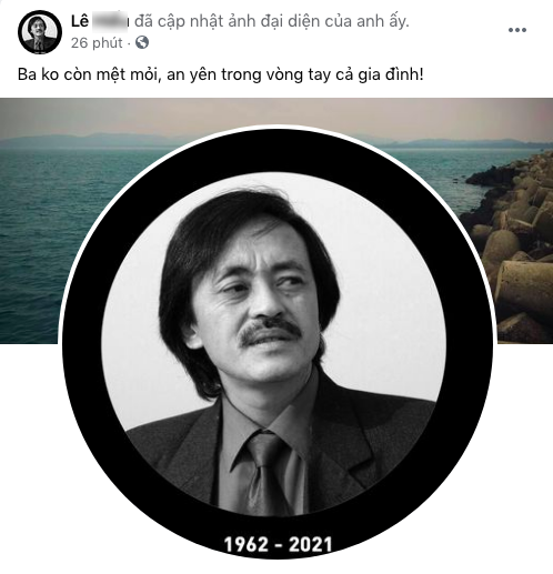 Trên trang cá nhân của mình, anh L.H., con trai nghệ sĩ Giang Còi đã chia sẻ hình của bố khi còn sống kèm lời tiễn biệt: "Ba không còn mệt mỏi, an yên trong vòng tay cả gia đình".