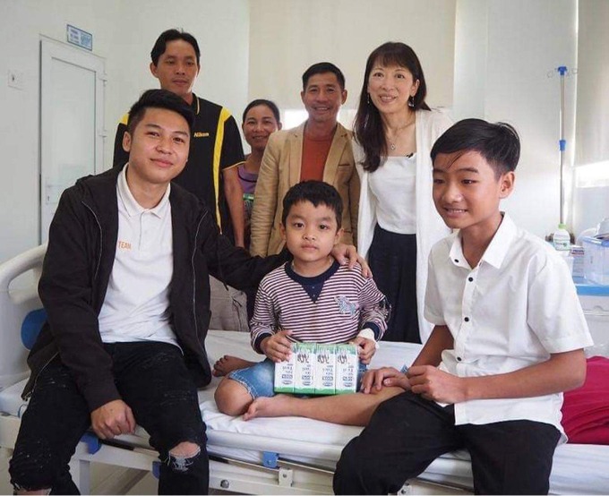 Nguyễn Anh Tài (đầu tiên bên trái) trở lại bệnh viện động viên những trẻ em ung thư và gặp "mẹ Nhật" vào năm 2019. Ảnh: Anh Tài.