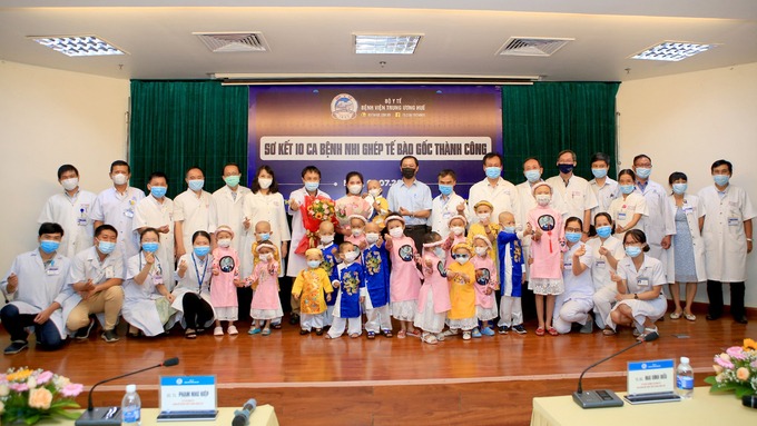 Hai đơn vị ghép tế bào gốc tại Bệnh viện Trung ương Huế đã tăng tỷ lệ sống cho trẻ em ung thư. Trong ảnh là lễ sơ kết 10 ca bệnh thành công, diễn ra đầu tháng 7/2021. Ảnh: Bệnh viện cung cấp.
