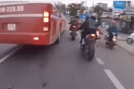 Tình huống va chạm khiến cô gái ngồi sau chiếc xe phân khối lớn đã bị ngã ra đường và lọt vào gầm chiếc xe khách ở kế bên. May mắn vào thời điểm xảy ra vụ việc, chiếc xe khách đang dừng chờ đèn đỏ nên không có hậu quả nghiêm trọng nào xảy ra.