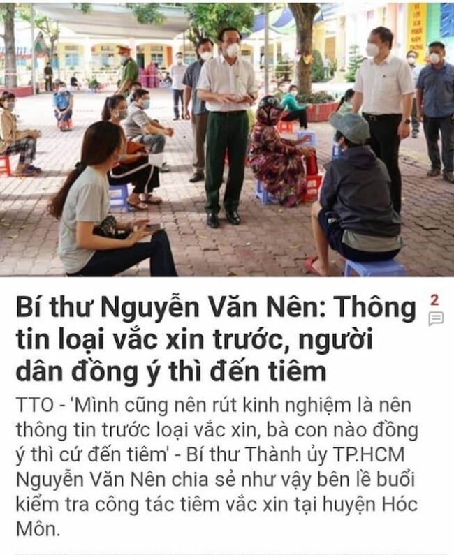 Nhắc lại, “Mình cũng nên rút kinh nghiệm là nên thông tin trước loại vắc xin, bà con nào đồng ý thì cứ đến tiêm” – Bí thư Thành ủy TP.HCM Nguyễn Văn Nên chia sẻ như vậy bên lề buổi kiểm tra công tác tiêm vắc xin tại huyện Hóc Môn, Sài Gòn.