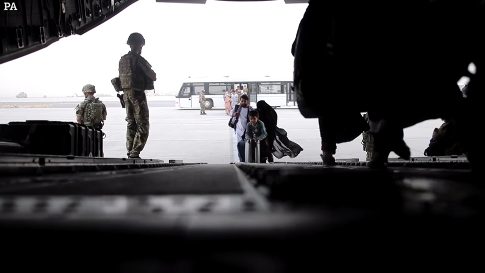 Quân đội Anh Quốc tại phi trường Kabul đang tiếp đón người dân Afghanistan đủ điều kiện tỵ nạn rời khỏi đất nước họ trên những chuyến bay cuối cùng – Chụp màn hình video