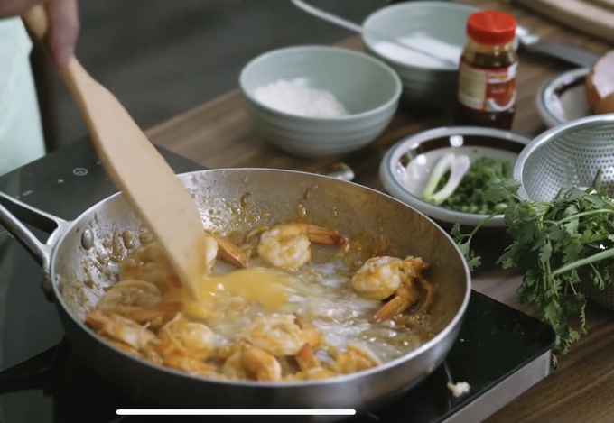 Tôm rim với trứng cùng các gia vị.