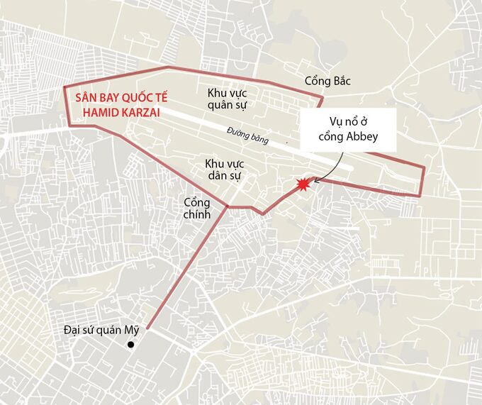 Vị trí vụ đánh bom ở thủ đô Kabul, Afghanistan ngày 26/8. Đồ họa: Business Insider.