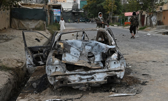 Ôtô hư hỏng trên đường phố Kabul sau vụ phóng rocket sáng 30/8. Ảnh: AFP.