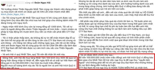 Khoản tiền 100 triệu chi cho nhóm thiện nguyện mua oxy gây hiểu lầm