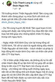 Sáng 31/07, anh Trần Thanh Long – đại diện đoàn thiện nguyện Nhất Tâm đã llên tiếng rõ ràng về toàn bộ khúc mắc. Anh Long giải thích, cảm kích trước phát nguyện tặng oxy miễn phí của vợ chồng bà Hằng nên muốn đến trực tiếp Đại Nam để cảm ơn cũng như làm thỏa thuận mượn bình. Thế nhưng, vì bản thân không đủ tự tin nên mới ngỏ lời mời ông Đoàn Ngọc Hải đi cùng. Bức ảnh chụp kỉ niệm bên dưới vô tình đã gây ra nhiều hiểu lầm đáng tiếc. Anh Long cho biết thêm, ông Hải trích 230 triệu để mua 100 bình oxy 40 lít nhập khẩu từ Nhật Bản chứ không phải mua oxy từ nhà máy của Đại Nam.