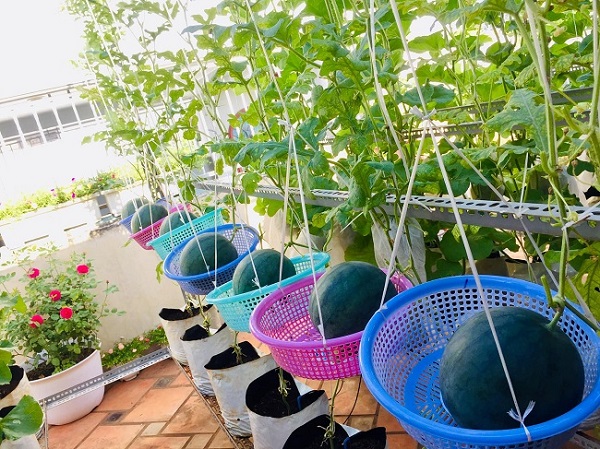 Khu trồng cây của chị cũng được đầu tư hệ thống tưới tự động, làm giàn sắt đặt chậu dưa. Chị cũng tự ủ các loại phân bón hữu cơ để bón định kỳ cho cây như đạm cá, trứng sữa, chuối, đậu tương, phân dơi…