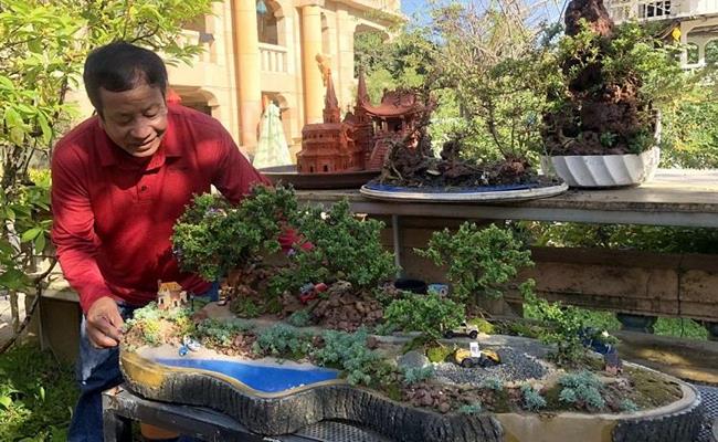 Ông Phúng phải đặt làm hoặc tự mày mò làm các bức tượng siêu nhỏ, sưu tập nhiều vật dụng trang trí cho chậu bonsai để tạo nên các tiểu cảnh nghệ thuật.