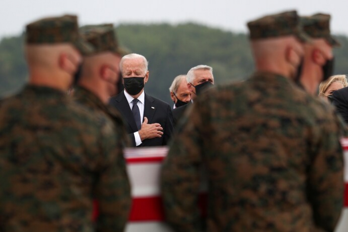Tổng thống Mỹ Joe Biden tại Căn cứ Không quân Dover ngày 29/8 trong nghi lễ đón nhận thi hài của các quân nhân Mỹ thiệt mang trong vụ tấn công ở sân bay Kabul. Ảnh: Reuters