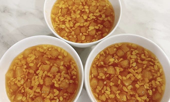 Chè khi nấu xong thấy độ kết dính bột năng và bưởi đậu xanh vẫn còn loãng, để nguội bột sẽ đặc lại là vừa.