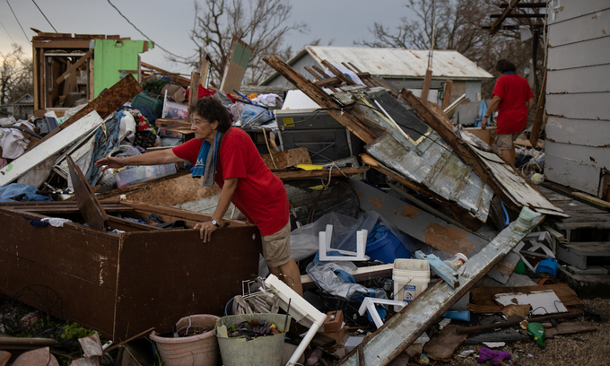 Người dân dọn dẹp đống đổ nát sau bão Ida tại Golden Meadow, bang Louisiana hôm 1/9. Ảnh: Reuters.