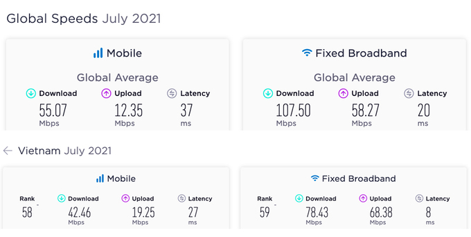 Tốc độ mạng di động và băng thông rộng Việt Nam đứng thứ 58 và 59 thế giới, trong đó, chỉ số tải xuống thấp hơn mức trung bình.