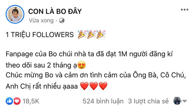 Hòa Minzy thông báo tin vui khi fanpage nữ ca sĩ lập riêng cho con trai cán mốc 1 triệu người theo dõi. Ngay dưới phần bình luận, nhiều netizen bày tỏ sự háo hức, "rần rần" chúc mừng chàng quý tử và mong bé Bo ra nhiều clip hơn.