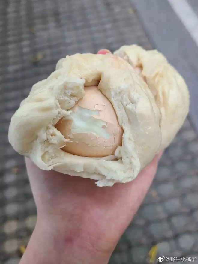 Không sai, đó chính là bánh bao nhân trứng. Là trứng gà nguyên quả. Đúng vậy! Nhưng còn nguyên cả vỏ trứng thế này là sao đây? Chẳng hiểu người làm bánh bao đã dậy sớm quá nên lúc làm nhân bánh lại buồn ngủ hay đây chính là điểm khác biệt của chiếc bánh phiên bản giới hạn nhỉ?