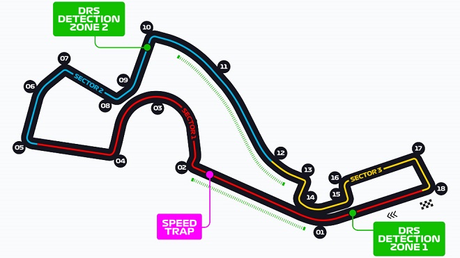 Có 2 khu vực DRS trên đường đua, lần lượt nằm trên đoạn thằng từ sau góc cua thứ nhất tới trước góc cua thứ 2, kéo dài từ sau góc cua thứ 10 tới trước góc cua thứ 13. Và thành tích lap record là 1 phút 35,761 giây thuộc về Lewis Hamilton thiết lập trong cuộc đua năm 2019.