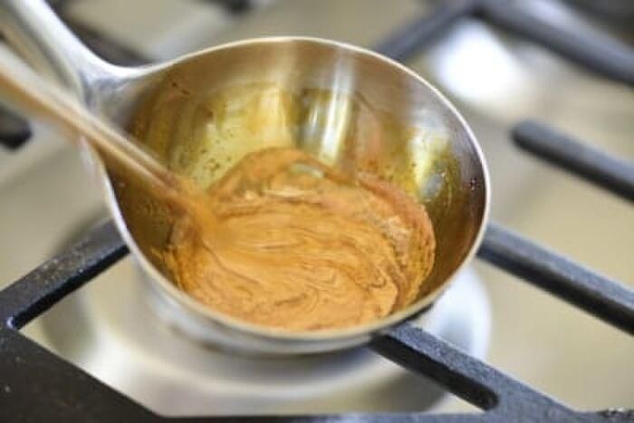 Cho 2 thìa đường vào chảo hoặc nồi. Bật lửa vừa để từ từ đun đến khi đường nóng chảy chuyển sang màu vàng thì tắt bếp.