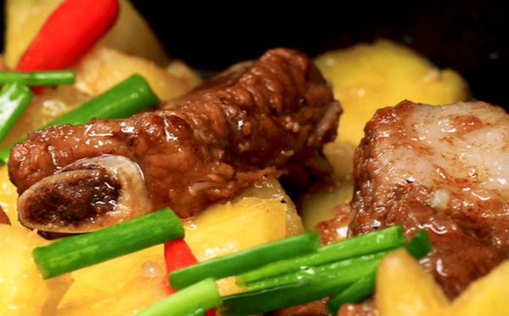 - Cuối cùng, thêm phần dứa đã đảo sơ vào nồi cùng phần ớt còn lại. Đậy vung và giảm lửa, om thịt thêm khoảng 5 phút. Nêm nếm lại gia vị, rắc hành lá và chút hạt tiêu vào.