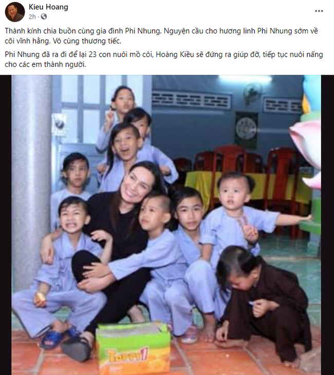 Cụ thể, trên trang cá nhân, tỷ phú Hoàng Kiều đã chia sẻ lời tiễn biệt dành cho Phi Nhung: "Thành kính chia buồn cùng gia đình Phi Nhung. Nguyện cầu cho hương linh Phi Nhung sớm về cõi vĩnh hằng. Vô cùng thương tiếc". Đặc biệt, tỷ phú Hoàng Kiều còn khẳng định rằng: "Phi Nhung đã ra đi để lại 23 con nuôi mồ côi, Hoàng Kiều sẽ đứng ra giúp đỡ, tiếp tục nuôi nấng cho các em thành người".