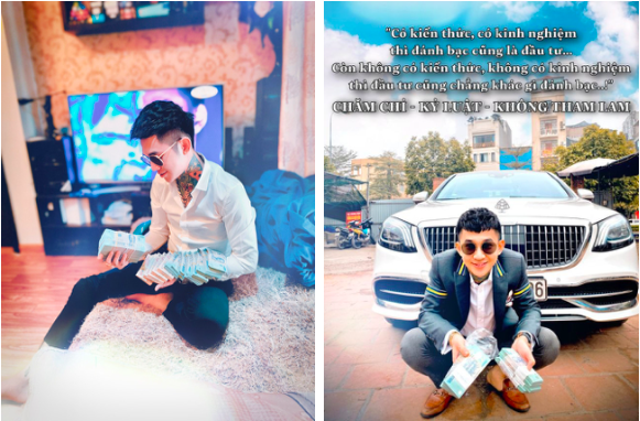 Trên trang cá nhân của mình, "Hoàng Tử Gió" thường xuyên đăng tải những hình ảnh về tiền bạc, xe hơi, check-in sang chảnh. Giống như những hot boy - hot girl tài chính 4.0 đã bị bóc trần, thanh niên này cũng không quên đính kèm những status về triết lý kinh doanh, làm giàu.