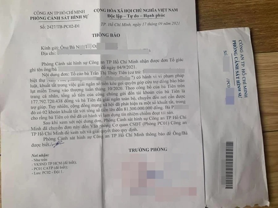 "Lại tiếp chuyện về tiền từ thiện của em Thủy Tiên. Ngày 17/9, phòng Cảnh sát hình sự thuộc PC02 có gửi cho tôi văn bản thông báo tiếp nhận điều tra đơn tố cáo mà tôi đã gửi cho cơ chức năng.