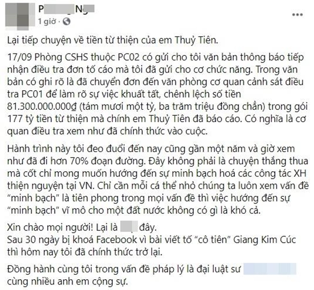 Trong bài đăng, P.N còn tiết lộ mình đã theo đuổi cuộc chiến pháp lý này được gần 1 năm chỉ vì muốn tìm ra sự thật trong chuyện từ thiện của Thủy Tiên. “Trong văn bản có ghi rõ là đã chuyển đơn đến Văn phòng Cơ quan Cảnh sát điều tra PC01 để làm rõ sự việc khuất tất, chênh lệch số tiền 81.300.000.000 đồng (tám mươi mốt tỷ, ba trăm triệu đồng chẵn) trong gói 177 tỷ tiền từ thiện mà chính Thủy Tiên đã báo cáo. Có nghĩa là cơ quan điều tra xem như đã chính thức vào cuộc” , P.N viết.