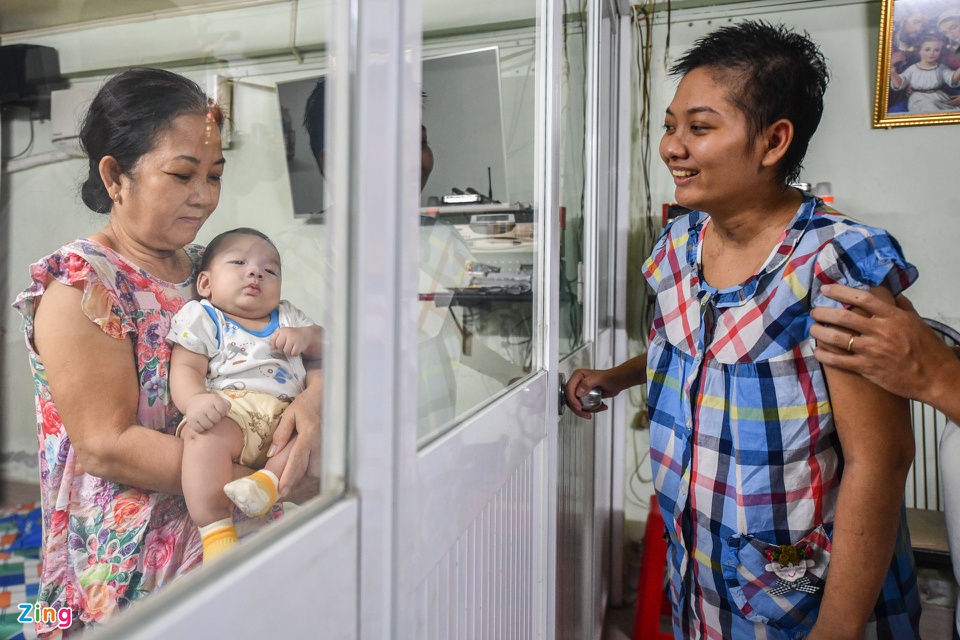Đứng sau lớp cửa kính, chị Thảo hạnh phúc nhìn đứa trẻ.