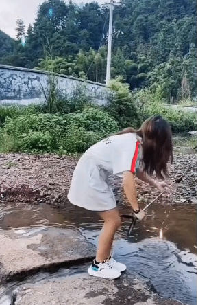 Cô gái trong video đã đặt điện thoại lên chiếc tripod cạnh một con suối nhỏ và bắt đầu công việc của mình.