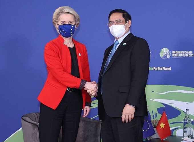 Bà Ursula von der Leyen cũng chia sẻ các ý kiến của Thủ tướng Phạm Minh Chính về những chủ đề được thảo luận ở COP26; hoan nghênh đóng góp của Việt Nam trong chống biến đổi khí hậu. EC cam kết mức phát thải bằng 0 đến năm 2050, cho rằng các quốc gia cần đặt mục tiêu tham vọng hơn mới có thể triển khai được. Đáp lại, Thủ tướng Phạm Minh Chính khẳng định, Việt Nam quyết tâm và cam kết mạnh mẽ về phát thải ròng bằng 0, thể hiện sự đóng góp tích cực, trách nhiệm của Việt Nam trong ứng phó biến đổi khí hậu; mong muốn EU tiếp tục hỗ trợ Việt Nam trong các lĩnh vực phát triển bền vững.
