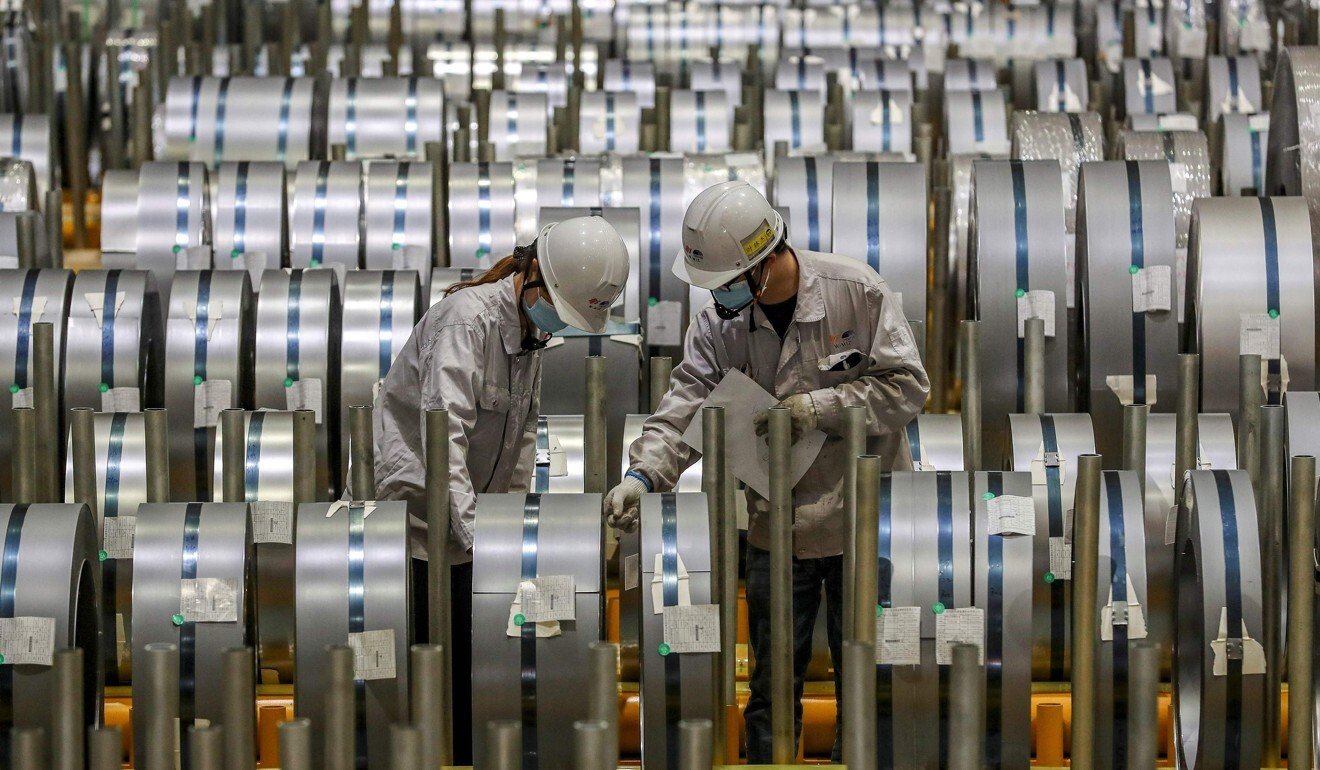 Công nhân kiểm tra các cuộn nhôm tấm tại một nhà máy ở Vũ Hán, thuộc tỉnh Hồ Bắc, miền trung Trung Quốc. Ảnh: AFP